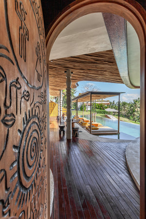 The land’s palm tree-fringed contours form a ceremonial walkway that reveals the hidden river valley below. Inspired by an ancient village untouched by time, the grounds follow the sacred Balinese wisdom of orientation to connect the spiritual realms in harmony.